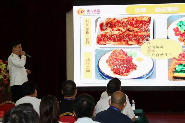 注冊中國烹飪大師、洛陽正大食品研發(fā)廚務(wù)總監(jiān)張立新先生向團餐大會介紹了洛陽正大食品開發(fā)的十余款預(yù)制豬肉調(diào)理產(chǎn)品,并從后廚實操角度分享了產(chǎn)品特色和賣點,逐一介紹了出餐加工標(biāo)準(zhǔn)和配餐流程。