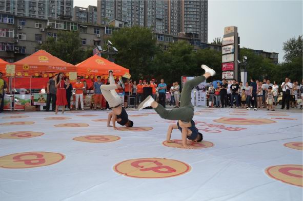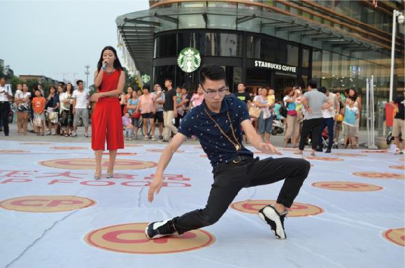 活動(dòng)時(shí)長大約30分鐘,首先快閃人員在王府井南昌路店門口廣場中央集合,穿戴著簡單大方、整齊利索的衣物四處游走在人群中。時(shí)間一到,音樂響起,歌手慢慢走近中央,一首振奮人心的“我和你”拉開整個(gè)活動(dòng)的序幕,瞬間引起了在場所有人群的關(guān)注。緊接著舞蹈演員閃亮上場,展開了一場激情澎湃的機(jī)械舞,帶動(dòng)現(xiàn)場觀眾情不自禁參與到表演中來,此時(shí)人流迅速聚攏,引起圍觀。然后正大食品有限公司員工身著公司服裝,唱著正大集團(tuán)《愛是正大無私的奉獻(xiàn)》一起出現(xiàn)在廣場中央,隨后幾段歌舞串燒將現(xiàn)場氣氛推向***,在觀眾意猶未盡之時(shí)迅速閃開在人群之中?;顒?dòng)過程中穿插進(jìn)行了分發(fā)公司宣傳材料、食品安全知識(shí)宣傳單,現(xiàn)場觀眾品嘗了洛陽正大豬肉調(diào)理品、醬鹵產(chǎn)品及集團(tuán)現(xiàn)代食品。